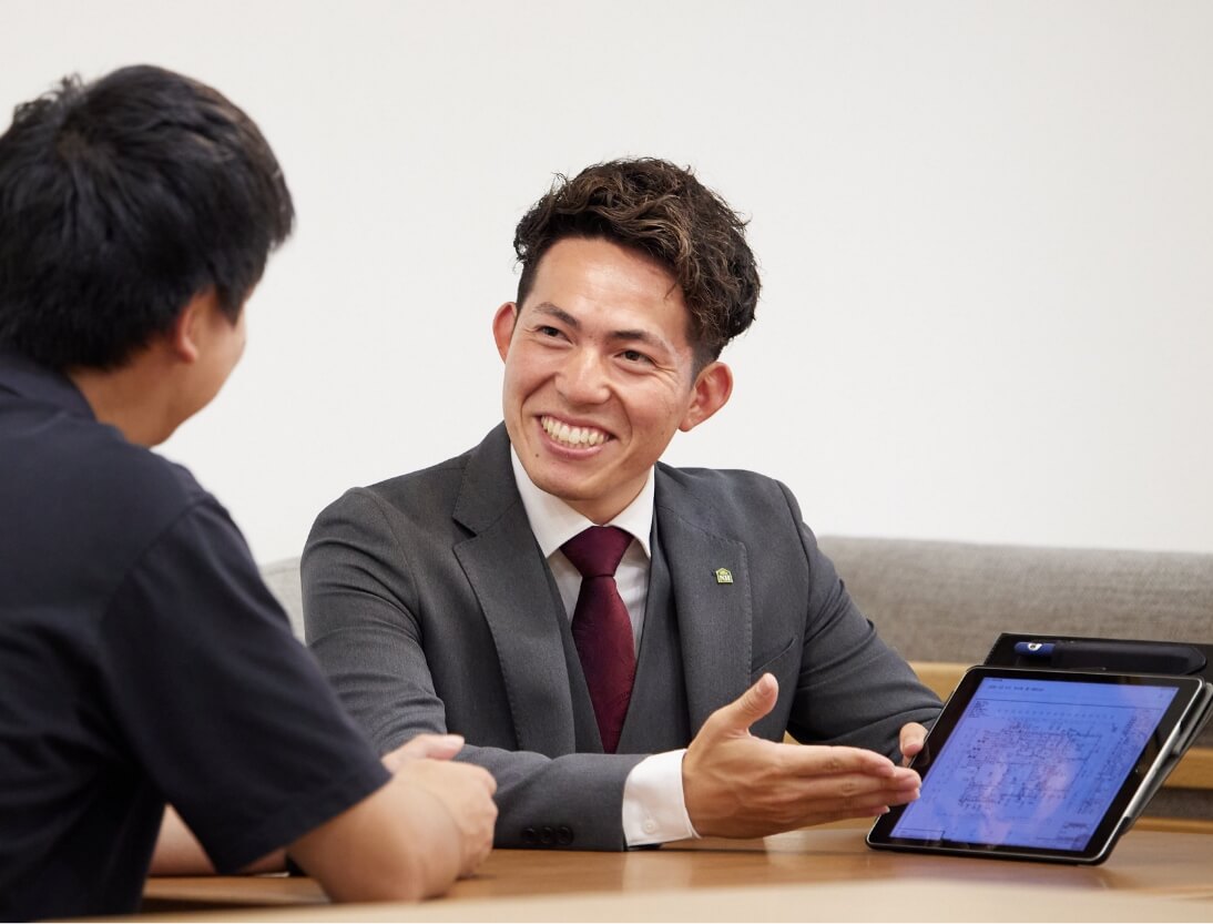 お客様のライフスタイルに合わせて外観、間取り、庭等全てを自由につくり“世界に一棟だけの家”を提供しています。平日の業務は、お客様が建築を希望してる土地の状態や建築するために必要な申請・許可などを調査したり、設計士と打ち合わせながらご要望に合わせた間取りを作成します。土日は、お客様の接客・案内や商談を中心に行っています。平日と土日では業務内容が大きく異なりますが、お客様へ“価値ある暮らし”を提供する上でどちらも欠かせない業務となっています。